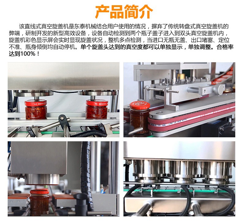 該直線式真空旋蓋機(jī)是東泰機(jī)械結(jié)合用戶使用情況,摒棄了傳統(tǒng)轉(zhuǎn)盤式真空旋蓋機(jī)的弊端,研制開發(fā)的新型高效設(shè)備,設(shè)備自動(dòng)檢測(cè)到兩個(gè)瓶子蓋子進(jìn)入到雙頭真空旋蓋機(jī)內(nèi),旋蓋機(jī)彩色顯示屏?xí)?shí)時(shí)顯示旋蓋狀況,整機(jī)多點(diǎn)檢測(cè),當(dāng)進(jìn)口無瓶無蓋、出口堵塞、定位不準(zhǔn)、瓶身傾倒均自動(dòng)停機(jī)。單個(gè)旋蓋頭達(dá)到的真空度都可以單獨(dú)顯示,單獨(dú)調(diào)整。合格